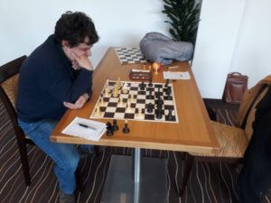 Při svém odjezdu jsem za „naprosto“ jasnou považoval pozici Marka Brčáka, když jeho soupeř Marián Petráněk ztratil několik temp v Sicilské a ocitl se pod velmi silným útokem. Podobně David Hák se vysmýkl po zahájení z pasivní pozice a byl to spíše Jaroslav Pekarovič, kdo začínal mít problémy. Ostrá pozice byla k vidění v pikantní partii Tomáš Válek – Alois Bartoš. Tomáš obětoval/přehlédl pěšce a Lojza ho ihned sebral. Rozehrál tím ovšem bílou věž a přišla navíc zajímavá oběť Jf5 !?!?, po které jsem musel odjet a pozici jsem hodnotil jako nejasnou 🙂 V ostatních partiích se nějaké větší „divočiny“ zatím neděly, očekával jsem pohodové vítězství cca 5-3 pro Tábor. Při odchodu jsem ještě na rozloučenou zvolal na chodbě „Ať zvítězí ten horší!“, což mi přišlo jako dobrý fór, no ale …