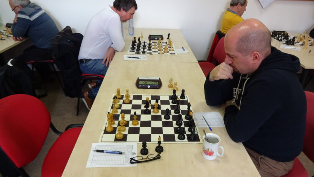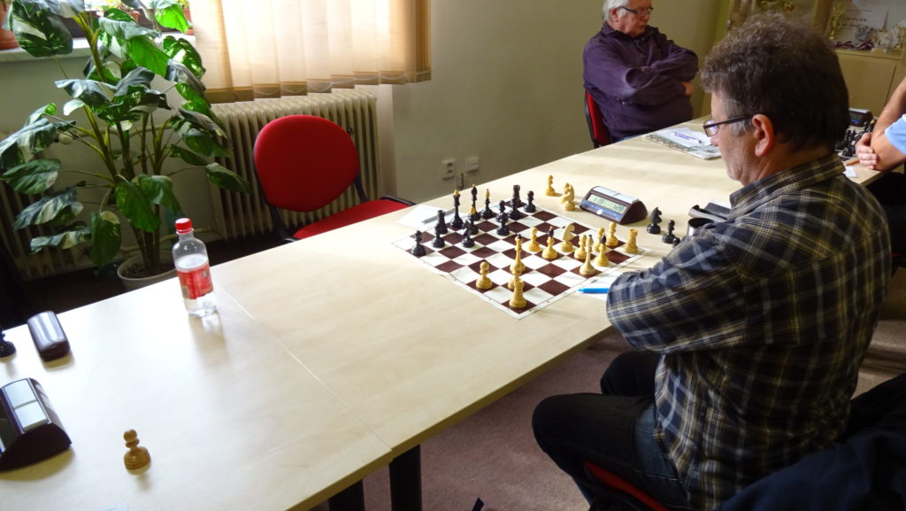 Petr Budilů, po dlouhé době opět hrající šachy, si to rozdal proti Vondráškovi. Sicilka s C3. Partii jsem hádal na jasnou remízu. Soupeř to hrál dobře, pozice byla celkem zavřená a nic jsem tam za černého neviděl. Pak ale Petr najednou vyhrává, po předchozí bezchybné hře soupeře. Tím bereme další bod a již máme jistou výhru 4,5 – 1,5!