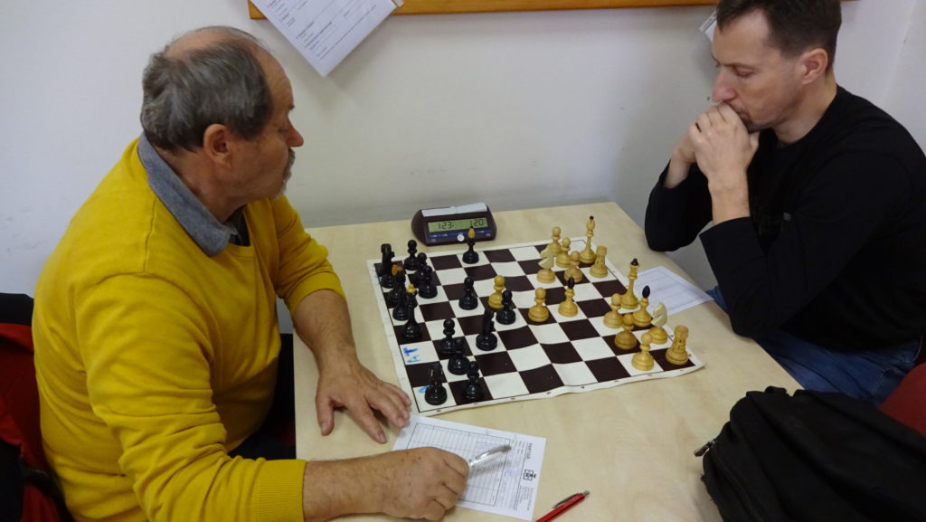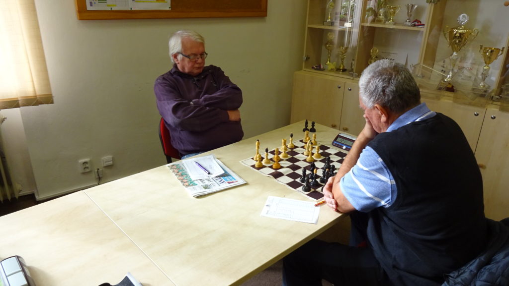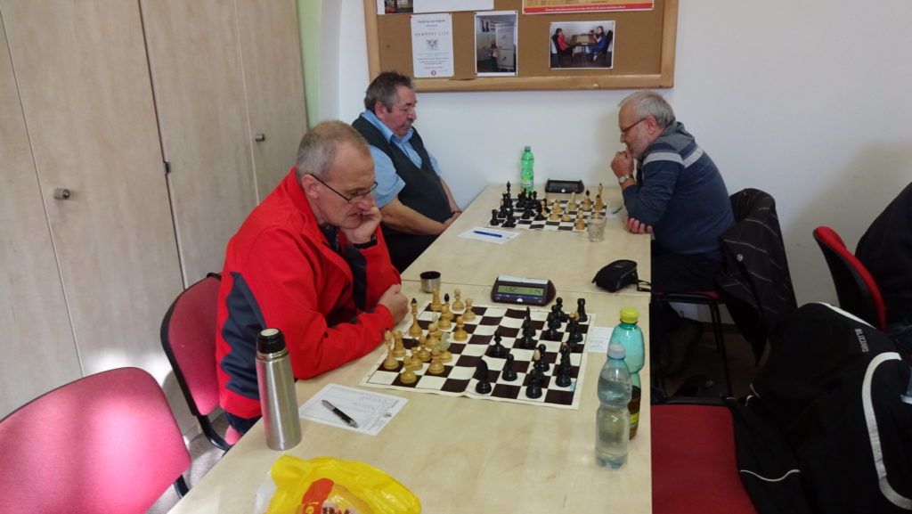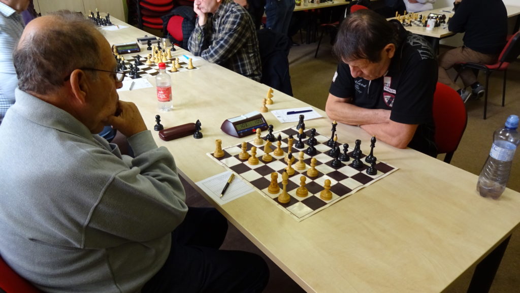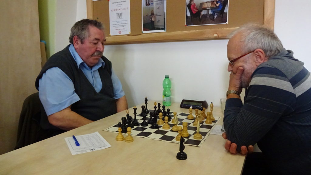 Vedle mne na 5. šachovnici hraje Miloslav Budilů proti Karlu Šedivému. Myslím, že tuto partii si oba pánové velmi užili, protože to byla velká podívaná. Nejdřív se mi zdálo, že stojíme lépe, leč pak bílý ztrácí kvalitu a bojuje o remízu. Hrálo se tzv. na krev, kdy to chvílemi vypadalo, že se podaří Karla někde nachytat, zvláště bílého pěšci byli velmi nebezpeční. Bohužel jsem neměl možnost to blíže sledovat, ale okolní parket byl nabitý přihlížejících diváků. Nakonec Karel Šedivý dokončuje co začal a upravuje stav na 4,5 – 2,5