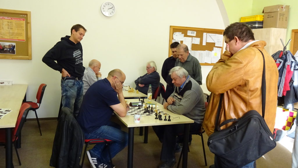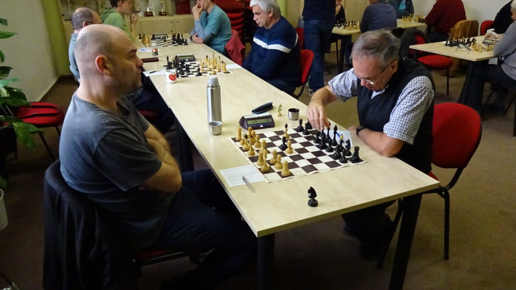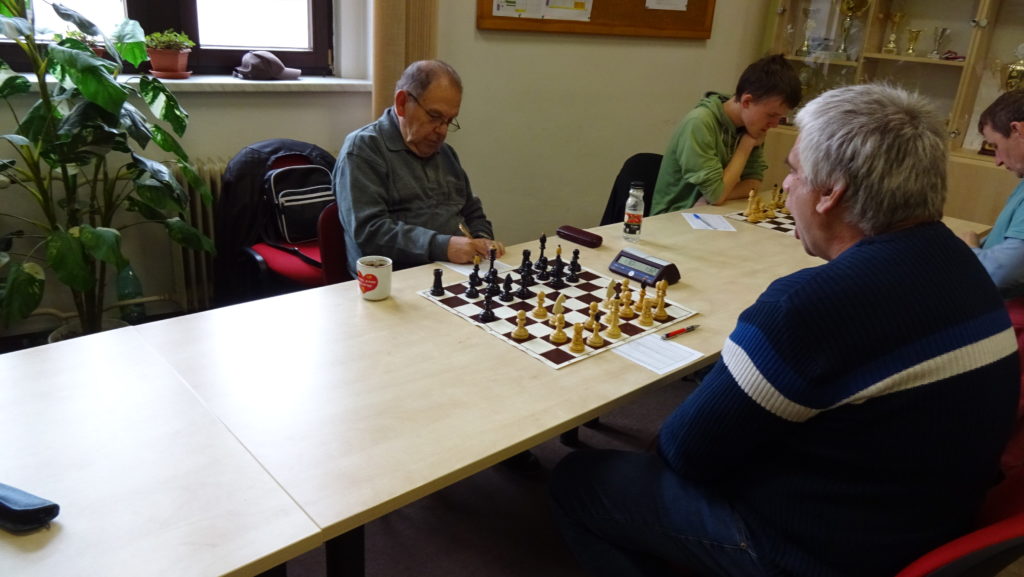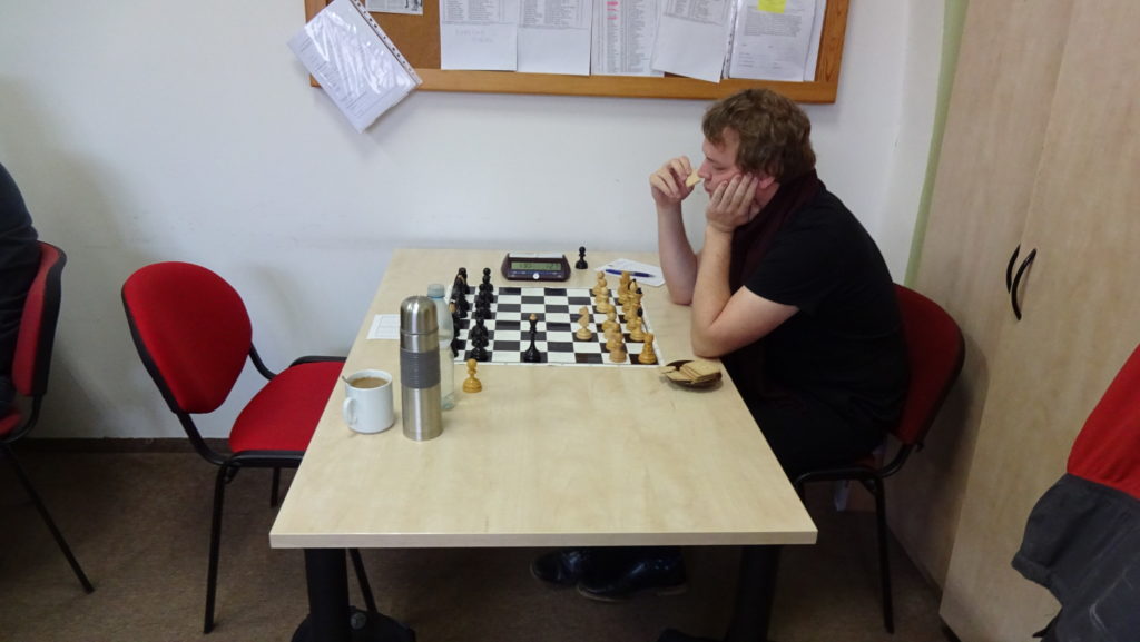 Jako kapitán jsem nešel týmu vůbec příkladem, kdy jsem hrál na poslední šachovnici proti Růžičkovi. Hraje se Skandinávská. Soupeř na prvních 7 tahů spotřeboval nějakých 20 minut, říkám si, asi jsem se mu netrefil do noty. Zkouším rychlé B5 a získat prostor na dámském křídle. Jenže slabina na C6 je velmi nepříjemná, navíc mi přestala úplně hrát dáma na A5. Při uzavřeném středu si soupeř převedl věž před mého krále a začal mne dusit. Stále jsem byl přesvědčen, že se v klidu ubráním a snažím se otevřít střed. Soupeř tam přeci jenom něco našel a získal materiál navíc. Zkouším ho ještě nachytat na švestkách, kdy zbývá do kontroly 15 tahů a má 2 minuty na tah. Bohužel se to nepovedlo a nezbývá mi, než se vzdát. Stav je 3:3