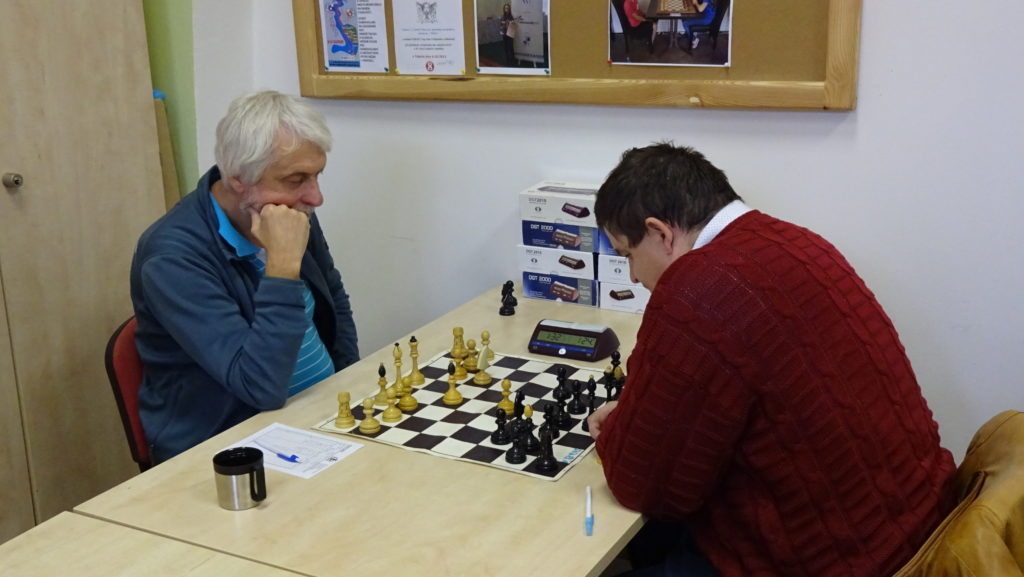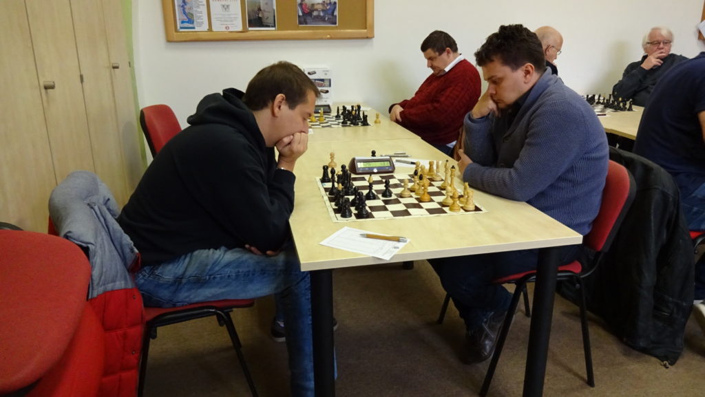 Naštěstí se ukazuje týmový duch. Marián ví, že se musí snažit svůj osud zvrátit. Situace na šachovnici není pro něj vůbec dobrá. Soupeř má 2 spojené volné pěšce, podporované věží a králem. Vypadá to, že je nemá co zastavit. To, že jsou šachy velmi psychologická hra, bylo ukázkově vidět. Nervozita se stupňuje a černý ztrácí jednoho pěšce, mění věže a přechází do remízové koncovky opakováním tahů. Soupeř si jistě musel po zápase sypat popel na hlavu. Získáváme cenný půl bod a stav je stále vyrovnaný 3,5 – 3,5!