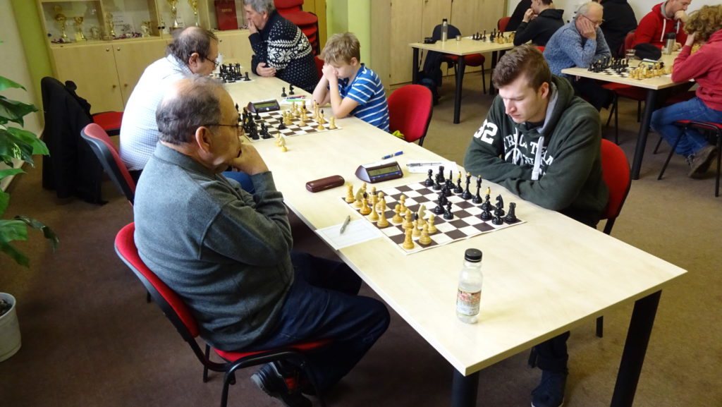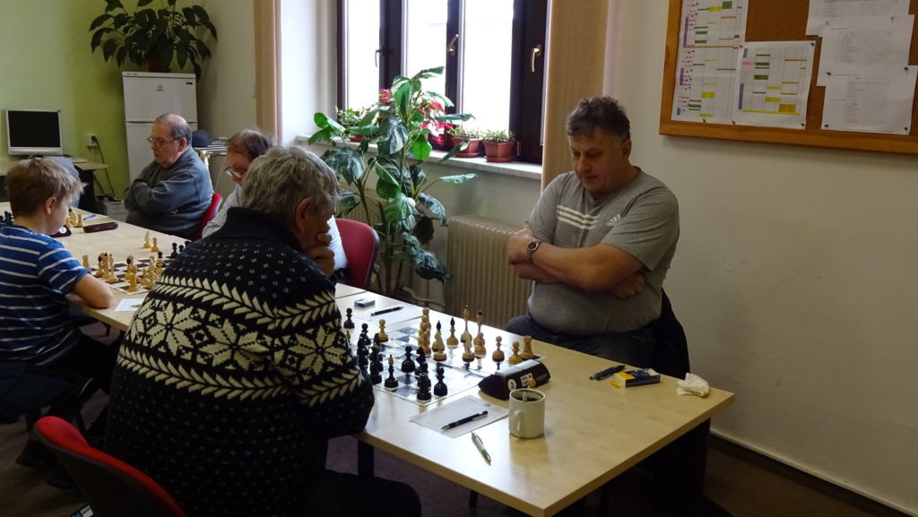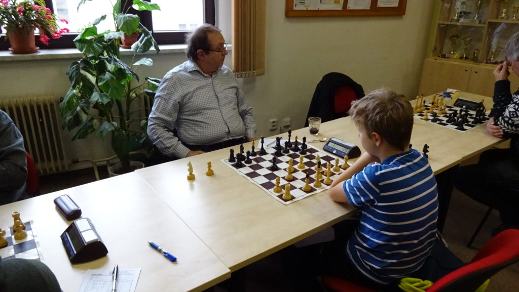 Na 4.desce, dneska konečně ne v roli kapitána, ale „řadového hráče“ hraji snad již třetí sezónu po sobě s Janem Rybínem. Hrajeme Královskou indickou, bílý volí okénko G3. Udělal jsem dvě zbytečná tempa a začal jsem si koledovat o problémy. Musím přiznat, že jsem ani nevím jak, nějak přešel do docela pohodlné hry, kdy jsem vyměnil dva pěšce a koně za věž. Ti pěšci nebyli vůbec špatní a tím stav pozice velmi nejasný. Nakonec jsme to usmlouvali na remízu a náš tým získává první půl bod! … stav 0,5:3