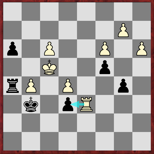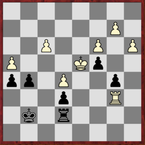 V pozici na diagramu po 48. Vb6, g5! jsem si vytvořil krajního volného pěšce, k němuž měl bílého král i věž daleko. Koukal jsem doma na počítač, který v té chvíli hlásí +1,3, takže stále pro soupeře dobré, ale ne vůbec jednoduché. Naštěstí udělal 2 zbytečná tempa věží