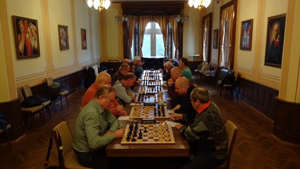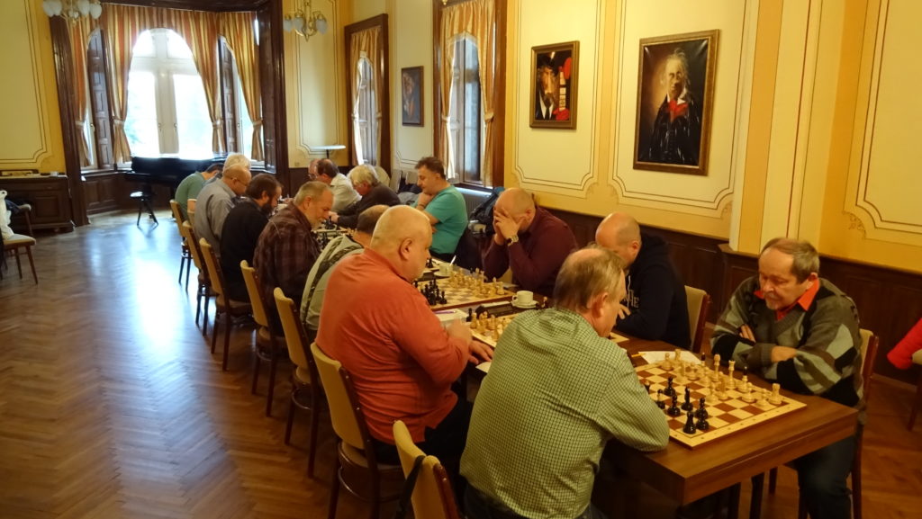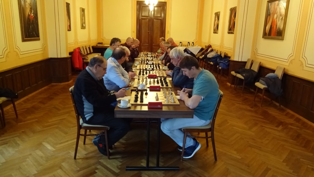 V neděli 27.1. 2019 jsme se vypravili do nedaleké Vráže, krásného herního prostoru v lázeňském domě, kde je vždy radost hrát. Velká síň, krásné šachy a hodiny. Všechno nasvědčovalo tomu, že hrajeme proti Písku. Byl to boj o první místo v tabulce do „skupiny o postup“. Jak už z nadpisu vyplývá, více se zadařilo našemu týmu a my hrdě postupujeme z čela tabulky.