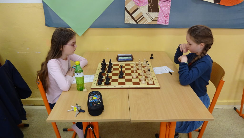 Na poslední hrála Dorotka, se svoji známou soupeřkou z mládeží Beátou. Holky hrály sicilku s C3, koukal jsem, jak pěkně hrají. Nakonec Dorotka získala kvalitu. Zde jsme již věřili ve vítězství. Bohužel Dorotka začala uplatňovat svou věž za střelce až ke konci hry, kdy se povyměňovala většina pěšců a materiální výhoda najednou ztrácí význam. Zůstal střelec proti věži, zde už nejde nic vymyslet. Remíza a stav je 1,5 – 0,5