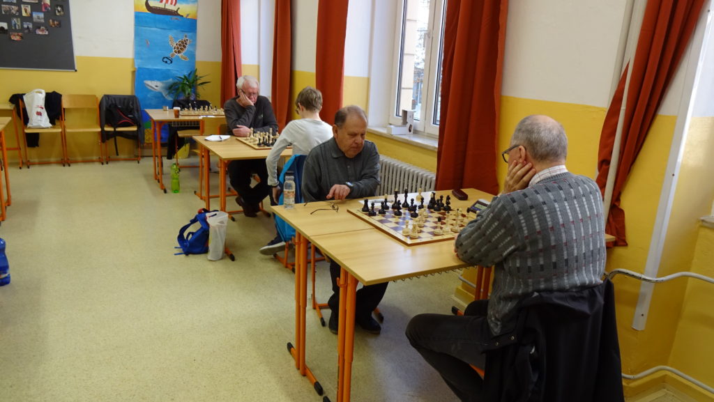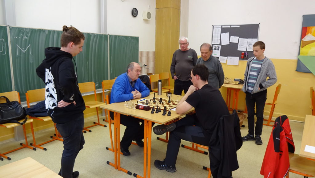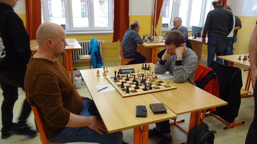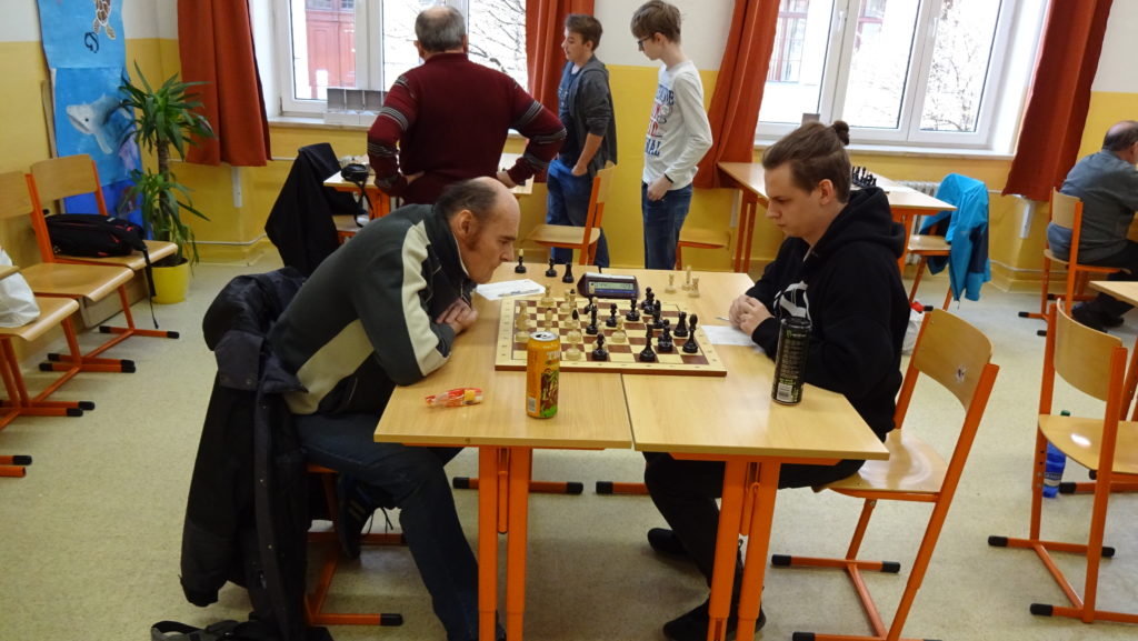 Poslední nadějí byl Lukáš Novák na čtvrté proti Jiřímu Havlíčkovi. Lukáš stál od začátku lépe, dokonce měl v jednu chvíli dva pěšce navíc. Soupeř ale v Královské indické konečně otevřel sloupec na bílého krále a začal taky hrát. Bílému zůstal slabý král a nehrající střelec na druhé straně šachovnice. Nic moc. Říkám s úsměvem Lukášovi, musíš vyhrát 🙂 Snažil se, ale soupeř nachází věčný šach … Bohužel, to byla naše poslední naděje. Remíza a celkový stav 3,5 – 4,5