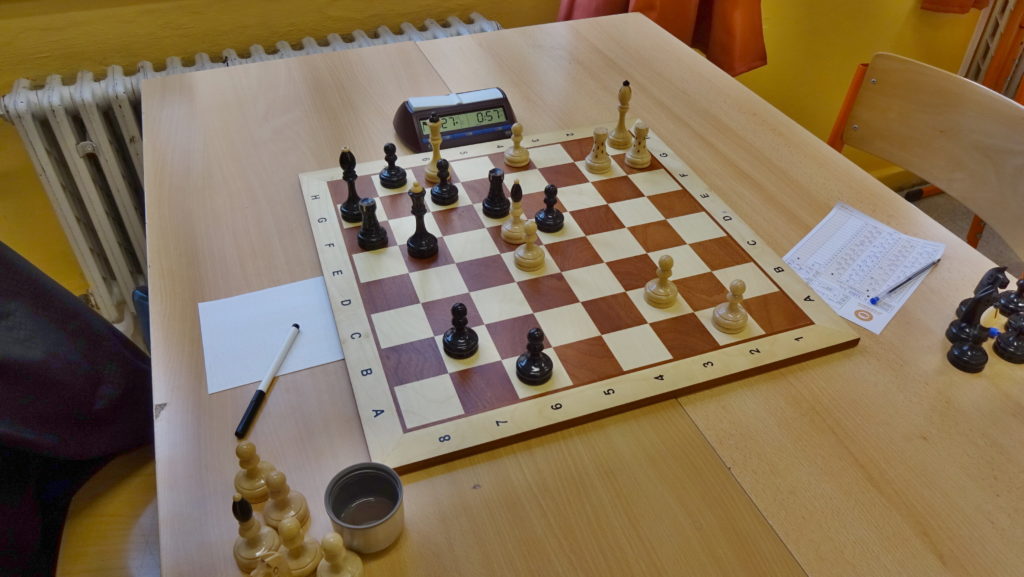 Na trojce hraje Luboš Otradovec proti Matěji Kaňkovi. Bílý hraje 2x domeček. Úplně nevím, jak to hrát, tak do toho „chvíli“ koukám. Zahájení jsem přežil jako černý dobře a jsem spokojen. Sice horší čas, ale věřil jsem, že rychle po jediném volném sloupci vyměním všechny figury a přejdu v klidu do remízy. Zde se ukázala rozdílná kvalita hráčů. Malé a nenápadné nepřesnosti dokáží rozhodnout a většinou je vám lepší hráči neodpouští. Stalo se z toho přesně to, co jsem nechtěl. Vostrá pozice s málo časem, která nakonec skončila mým matem. Stav je k mé nelibě 2 – 3
