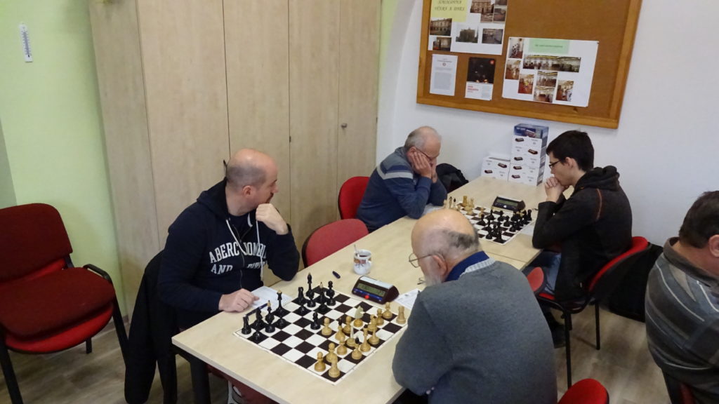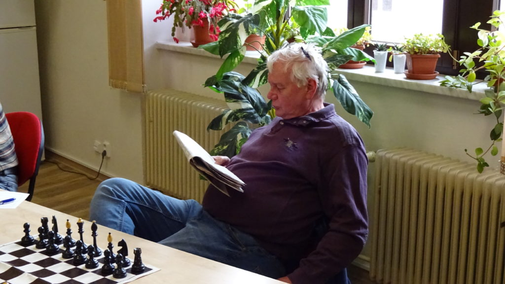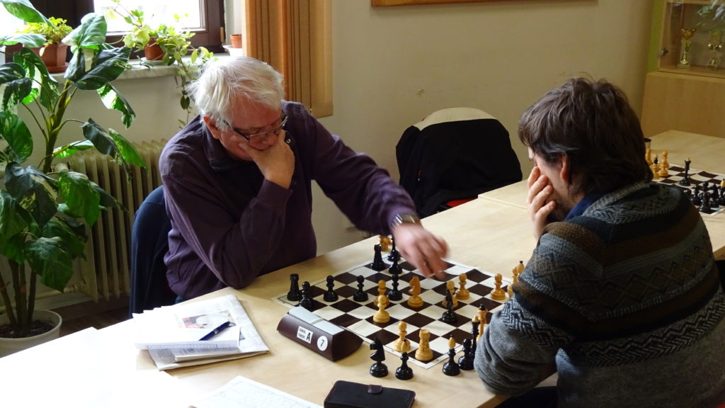 Poslední dvě partie. Já bojuji s časovkou v trochu lepší pozici a Míla Budil na 5. bojuje o svůj krk. Na to, že je bílý, stojí pasivně. Vše ale zatím ok. Pak vidím, že soupeř je o pěšce méně, za to ale má nebezpečného pěšce na 2. řadě. Je slabý nebo silný, to jest otázka. Nevím, co se stalo, ale zjevně nějaký plundr a pozice se okamžitě rozpadá a Míla Budil se ihned vzdává. Dneska mají Budilové špatný den a stav je tímto vyrovnán na 3,5 – 3,5