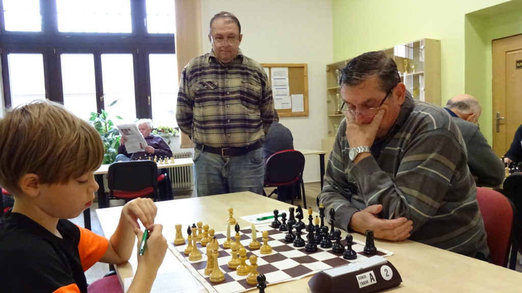 Mezitím na 6. šachovnici probíhají tuhé boje. Jirka Severa proti mladému Lukáši Píchovi (kterého dobře z nám z Lojzovi Polepšovny :)) Mladý klučina klame tělem a nebojíc se pustil s vervou do Jirky Severy, kterému začal pořádně zatápět pod kotel. Bílý začíná útočit na černého krále a bombarduje jeho rošádu. Dokonce obětuje svého střelce za útok. Po zápasové rozhovory tvrdí, že to měl Lukáš vyhraný. Já se jdu podívat v době, kdy se mne Jirka Severa ptá na remízu. Vidím figuru za dva pěšce, útok bílého již žádný, tak říkám: „Figura je figura“. Jirka hraje tedy odvážně dál (velmi důležitý moment utkání!) a postupně získává materiál navíc a vítězí!!! Důležitý bod utkání a děkuji domácímu borci, že to nevzdal 🙂 Vedeme 3,5-1,5