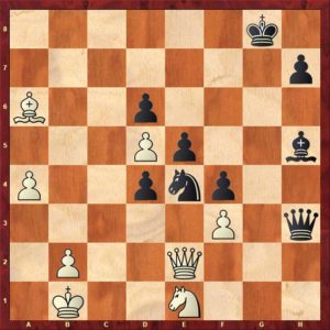 Trochu zkušený šachista by měl najít nejlepší pokračování v řádu vteřin. Dorotka také „mrkla“ na pozici a az chvíli povídá … „Já bych hrála 1. … Jxe4!“ „Výborně“, já na to. V tu chvíli jsem dostal nápad, že pozici dohrajeme. „A teď si partii zkusíme dohrát. Ono je někdy jednodušší najít taktický úder, než pak celou partii dovést do vítězného konce“ …