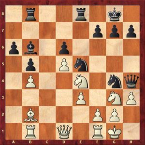 Petr Loskot – Robert Doring. Na stole skotská hra , poměrně známá varianta se Sb4. Soupeři se vyhýbají známé koncovce, kde má černý pochroumané pěšce, ale zato dvojici střelců a radši hrají střední hru. V té si udržuje mírné plus Petr (aspoň tak se nám zdá), postupně se hra vyrovnává. Mezitím došlo k razantní změně na první šachovnici, IM Vasil Tričkov si tam vzal odvážně pěšce na b2 (řekl bych odvážně a principiálně). Vznikla klasická pozice, ve které se černý snaží dokázat, že jeho valy jsou pevné, kdežto bílý se snaží černého přesvědčit, že lup takového pěšce je příliš velké sousto. Pokud se černý stihne vyvinout, pak se pěšec navíc může hodit. To se ale nepovedlo, Zdeněk získává silný tlak a černý chybuje! Bílý stojí na výhru!