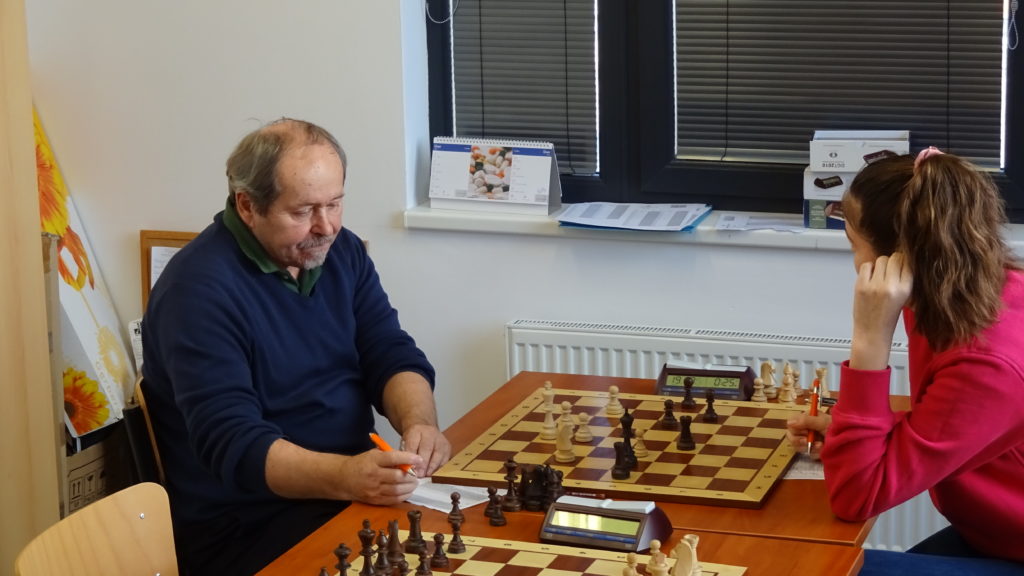 Petr na 5. vidím, že má o figuru více. Později přidává druhou, až se nakonec soupeř vzdává. Vedeme již 3,5 – 0,5