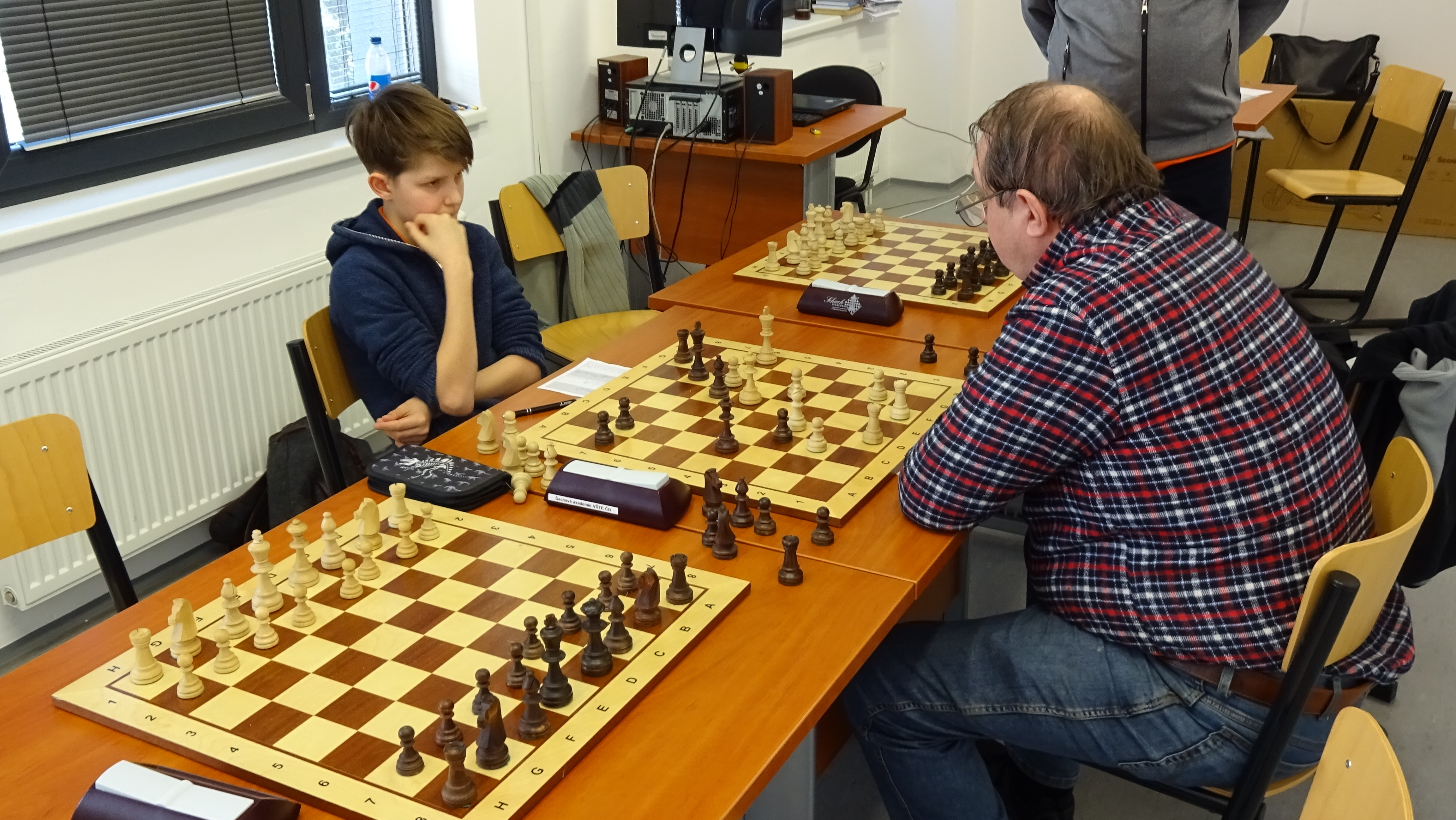 Lukáš Novák hraje svůj oblíbený dámský gambit, proti kapitánu soupeřů Rudolfu Černíkovi. Ten reaguje tahem f5.