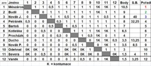 Rozhodčí pan Václav Hašek zaslal konečné a definitivní potvrzení výsledků, takže je tu souhrnný článek k nedávnému oddílovému dění. Pojďme nejprve na hlavní událost, oddílový přebor v „klasickém“ šachu. Slovo klasické dávám do uvozovek z důvodu, že tempo 2 x 60 minut +30 sec na tah je jakýmsi přechodem mezi klasikou a rapidem. Ale v dnešní zrychlené době lze už toto tempo nazvat klasickým šachem :-).