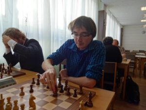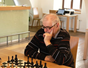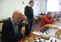 Legenda našeho šachu vs elitní český velmistr z „klubu 2600“. Rauzerova varianta sicilské hry. Zpočátku se mi zdálo, že veterán stojí lépe, polehoučku však figurky černého začaly skákat na ta správná políčka a získávaly stále větší a větší „akční rádius“. Párkrát jsme byli u této šachovnici „na návštěvě“ společně s Honzou Havlíkem, vždy jsme „znalecky“ pokývali hlavami a radši se vrátili ke svým šachovnicím. Posuzovat hru obou borců si netroufám. „Zničeho nic“ měl černý zničující útok a pan rozhodčí zapsal do zápisu 0-1. Tedy vedeme …