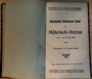 Další skvost v naší knihovně. Moravská Ostrava byla v roce 1923 pořadatelem významného šachového turnaje. Šlo mimo jiné o první turnaj, kterého se účastnil Emanuel Lasker poté, co v roce 1921 přišel o titul v zápase s Capablancou. Turnaj byl hrán v hotelu Royal ve Vítkovicích.