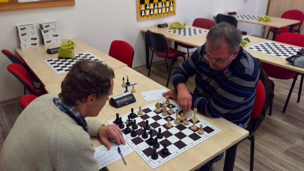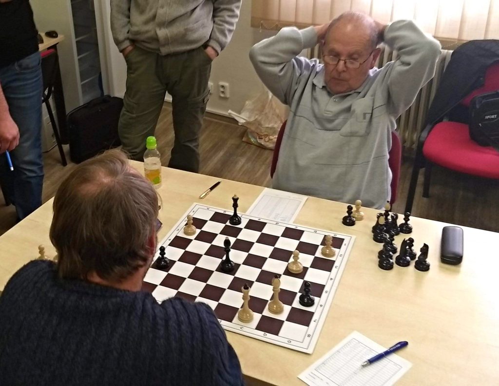 Pokračujeme na mou partii. Snažil jsem se to hrát celé pozičně, v poklidu, žádný spěch. Soupeř to ale správně otevřel a moje figurky nebyly sehraný, stály „lidově blbě“. Nějak jsem se z toho ale dostal, navíc soupeři 15 tahů před přidáváním začíná tikat 10 minut. Spousta taktitky a já nakonec vycházím s pěšcem více a i s vyhranou pozicí (po zápasových analýzách se soupeřem). Soupeř mi to ale ulehčil, kdy se natolik zamyslel, že mu spadl prapor asi ještě 10 tahů před koncem. Výhra a my dorovnáváme na 1,5 – 3,5