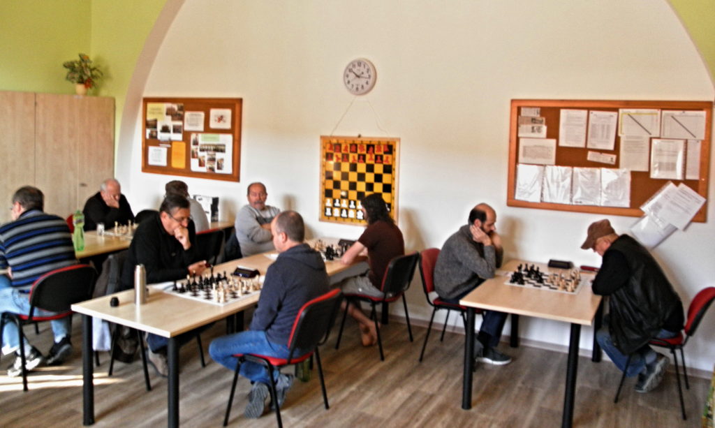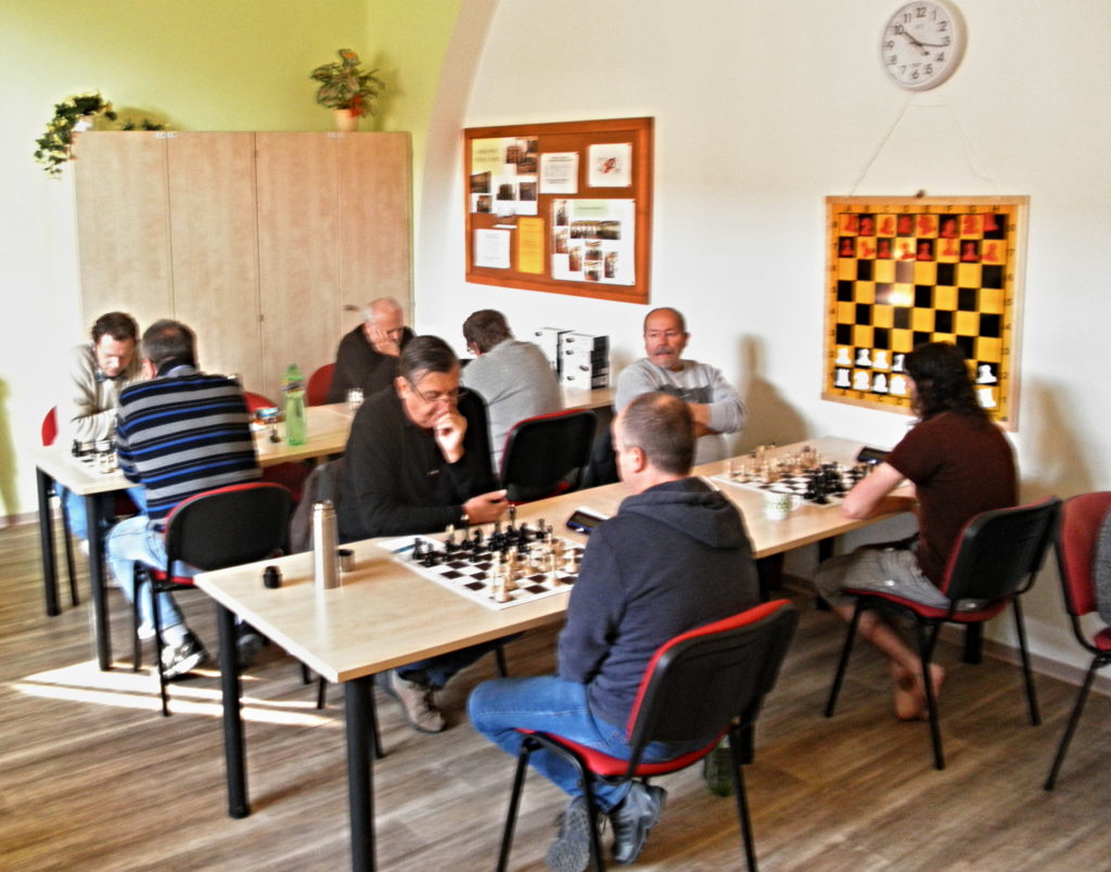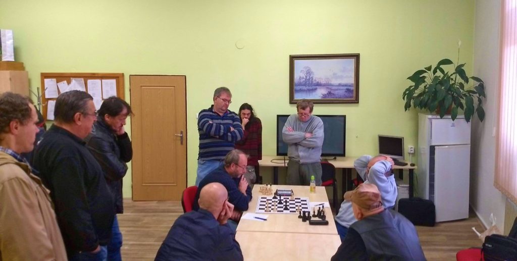Třetí končí Franta, hraje se anglická. Líbilo se mi, jak Franta rozjíždí útok pěšci před svým králem na krále na opačné straně. Vlastně jsem si až po tom řekl, jak geniální! Franta to komentoval jinými slovy: „Bude to o držku“ 😀 … Franta měl podle mě jasný plán, tahem g5 kopnout soupeřovic koně, Dh5, Vf3 – Vh3 a dát mat. Soupeř se správně snažil otevřít střed a zaměstnal tím našeho borce natolik, až se mu neporařilo dokončit svůj plán. Nakonec to nevyšlo a prohráváme 0,5 – 2,5