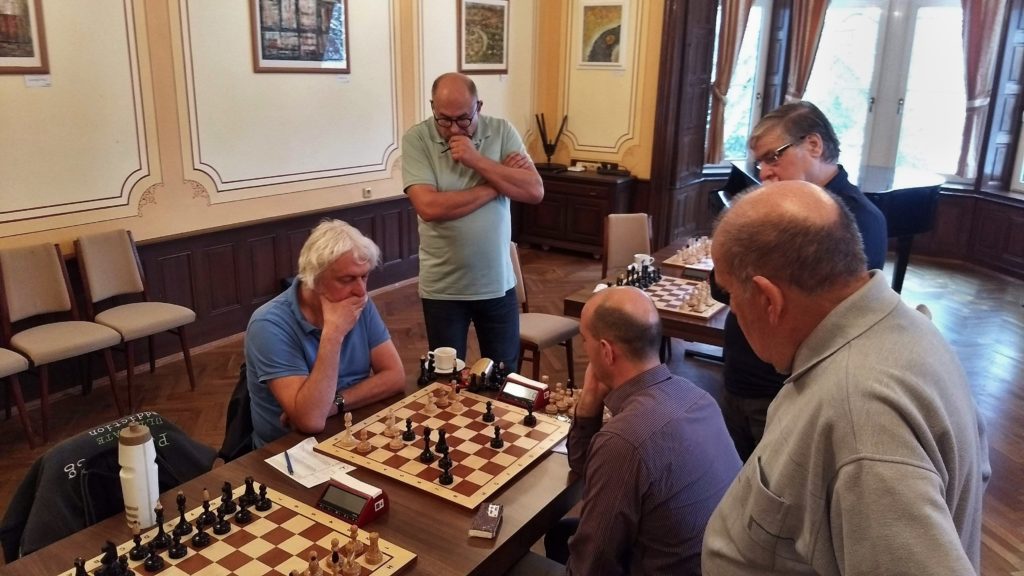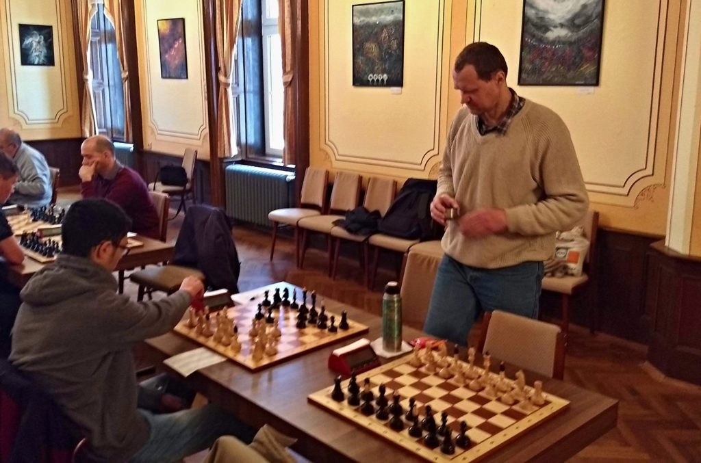 Vedle něho bojuje Vladimír proti Francouzské obraně. Vladimír hraje variantu se Sg5 a pokrytí pěšcem H4. Nejdříve to vypadá na hurá útok, pak se to ale obrátilo a musí se bránit bílý. Vláďa to má ale všechno kryté a pozice přechází pomalu ale jistě do koncovky, kdy má Vladimír, jako měl Luděk pěšce na H6 a lepší pozici do koncovky. Neviděl jsem přesně konec, ale Vladimír vítězí a stav je 3 – 3