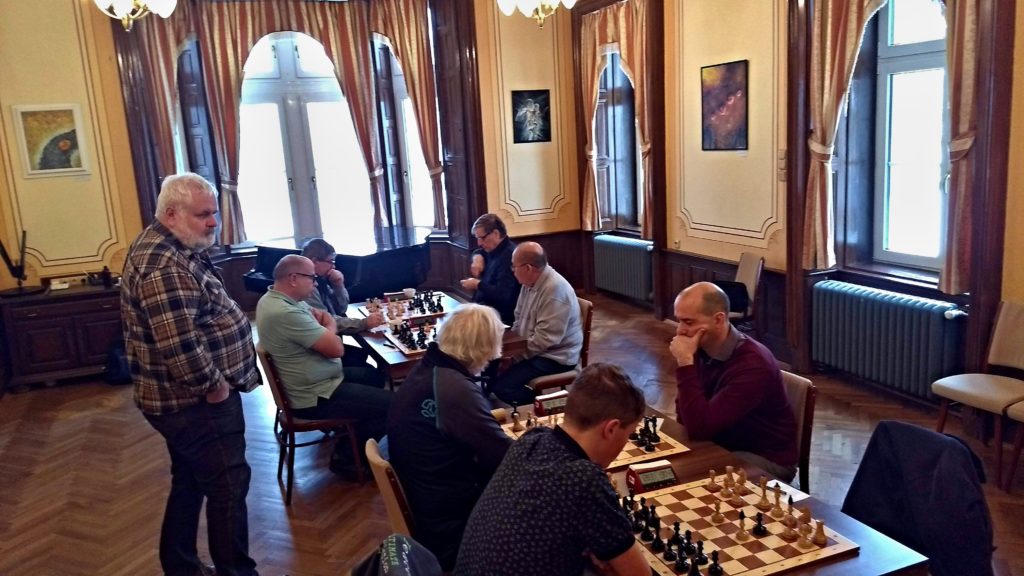 Poslední partie, Milan Hrubý sedící vedle mne. Zahájení Vídeňská hra. Netroufám si moc hodnotit, nazval bych to „taková divočina“ :DD. Více se mi spíše líbila pozice soupeře, který měl více prostoru a lépe umístěné figurky. Nastala chvíle, kdy Milan hraje asi 20 tahů s pár minutami na hodinách. Všichni trneme, Milan se ale v pozici neztrácí a zvládá časovou kontrolu, kdy na stole má věž + pěšce vs jezdec a střelec. Pěšec ale rychle padá a pozice nevypadá dobře. Milan ale volí výborný a asi i jediný plán a to dojít se svým králem až na druhou řadu, kde stál jako osina v zadku. Soupeř později ztrácí dva pěšce a už to vidíme na remízu. Milan ale hraje dál a daří se mu prolomit pěšce navíc do dámy, kdy o jedno tempo je rychlejší než soupeř (opět s minutou na hodinách :DD) a senzačně VÍTĚZÍ!!!