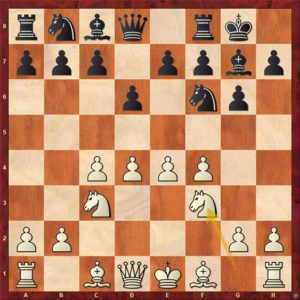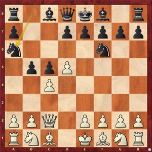 V souboji dvou Milanů bylo zřejmé, že přijde 1.e4 e5 2.Jf3 Jc6 🙂 A co dál? Ve hře bylo několik možností, nakonec padla volba na 3. Sb5, čili „starou dobrou španělku“. Tím však „sázková jistota“ skončila. Přišlo 3. … Jf6!? (to nevím, zda-li Milan někdy hrál) a bílý se necítil bý povolaným prorážet berlínskou zeď, takže přišlo 4.d3 … a hrálo se. Po tomto „psychologickém“ úvodu hlavní roli přebrala diagonála a1-h8. Černý se snažil z ní „něco vyždímat“, bílý doufal, že ždímat nebude co. Objektivně byla asi hra stále v rovnováze. Milan ml. 🙂 se pak dopustil nepřesnosti, kterou mu Milan st. záhy oplatil. Partie mohla znovu sklouznout do širokých mezí rovnováhy. V ten moment si však černý neopatrně sebral pěšce na b2 …