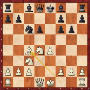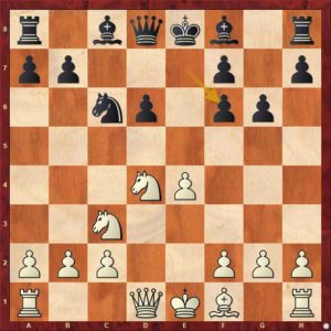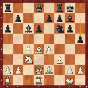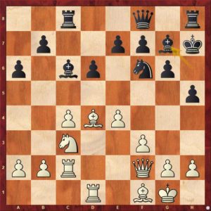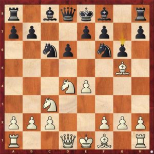 Černý svým posledním tahem 13. ... h5 plánuje vyvinout svého střelce na h6 i když to tak na první pohled nevypadá. Další průběh partie to však potvrzuje. 14.Vac1 Kh7 15.Se3 Vh8 16.Vc2 Vc8 17.Sf1 Df8 18.Df2 Sh6 cíle je dosaženo. 19.Sd4! bílý střelce nehodlá vyměnit a černý se vrací střelcem zpět 19.- Sg7 viz diagram