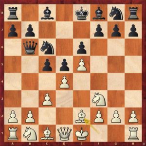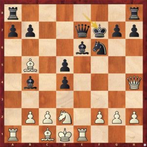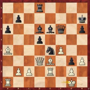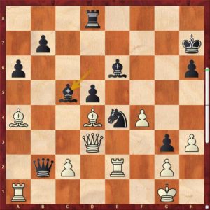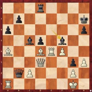 Tuto pozici už engine „šacuje“ na vyhranou pro bílého, ale když oba hraáči hrají „na vteřinách“, tak to vůbec jasné není. Zde se Tomáš rozhodl pro ostrý řez …
