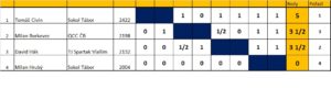 Se stejným bodovým ziskem pak protli cílovou pásku David Hák a Milan Borkovec … 3 1/2 bodu. Vzhledem k vzájemnému duelu 1 1/2 – 1/2 pro Davida přisoudíme stříbro Davidovi Hákovi. Pomyslný bronz patří Milanu Borkovcovi.