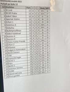 Po tomto kole (9.kolo) jsme se už pohybovali „poblíž bedny“ a začali jsme pošilhávat po stříbrné medaili. Ovšem v této euforii došlo k „přešlapu“. V 10.kole nás přibrzdil Smíchov A … 1 1/2 – 2 1/2, když se partie vymkla mně :-(.