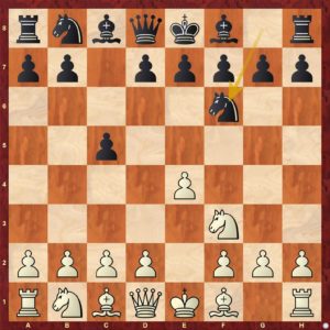 Diagram č.1 - Tah 5 ...Se7!? není sice chybou, ale černý v tomto zahájení hrává c7-c5, takže tak mělo přijít rovnou. V případě Se7 černý "riskuje", že po vzeti dxc5 musí ztratit tempo na Sxc5 ...