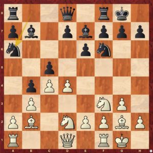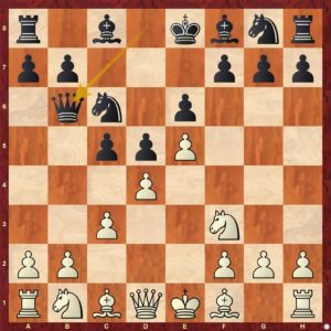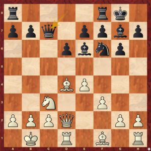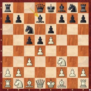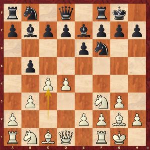 Diagram č.2 - V dané pozici je určitě lepší vložit výměnu 7 ... dxc4 8. bxc4. Tah 7 ...b4 !? (?!) je zde horší ...