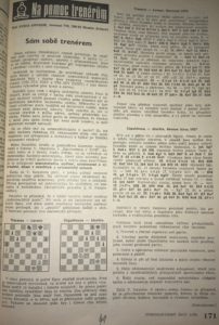 Starší ročníky šachistů … mno, lépe zkušenější ročníky si jistě pamatují, že v časopise Československý šach vycházely na pokračování články s názvem „Na pomoc trenérům“. Tuto rubriku řídil vynikající trenér ing. Vratislav Hora, už toto je samo o sobě důkazem vysoké kvality těchto článků. V rámci této rubriky byla kapitola „Sám sobě trenérem“ (10 dílů!), kterou pro změnu řídil další skvělý trenér ing. Evžen Gonsior. Kdysi jsem si zpracoval všechny své staré Čsl. šachy a vystřihl si z nich (pro mne) to nejzajímavější a nechal si vše svázat. Pro zajímavost ukázky …