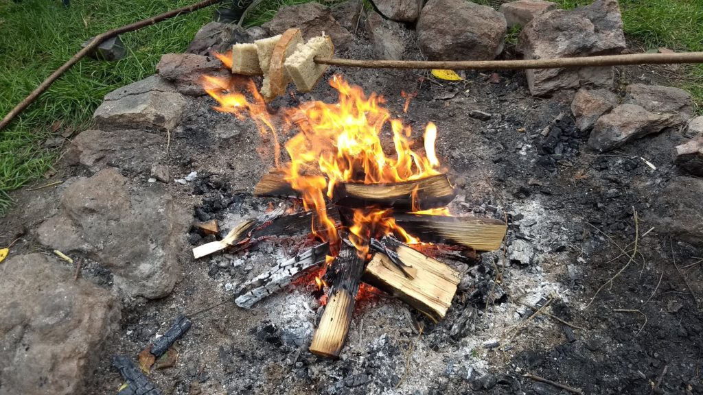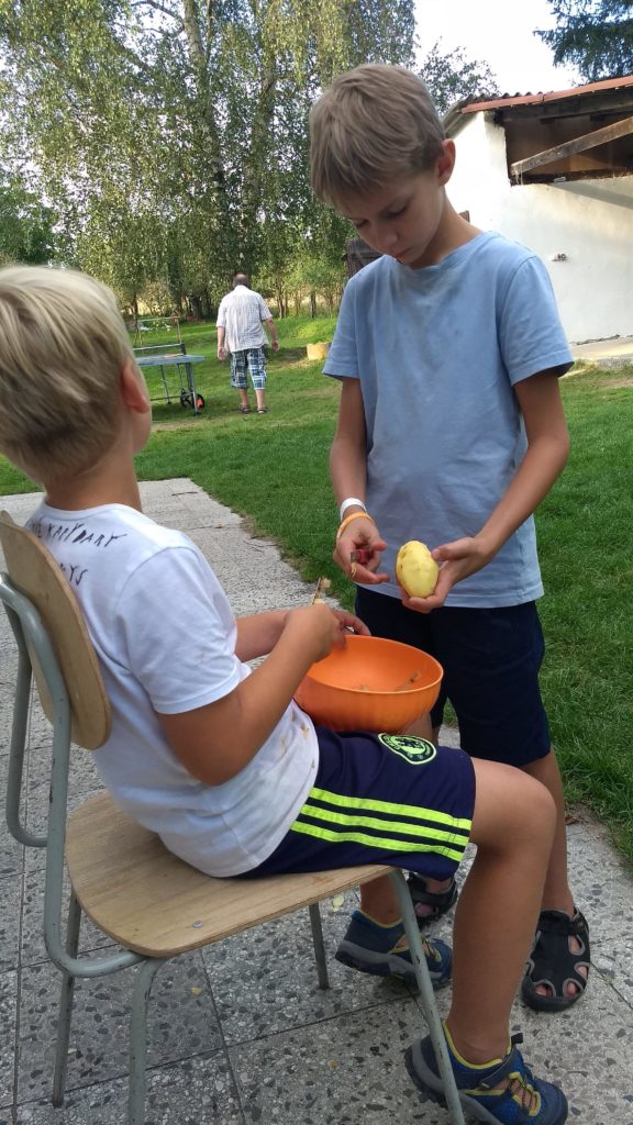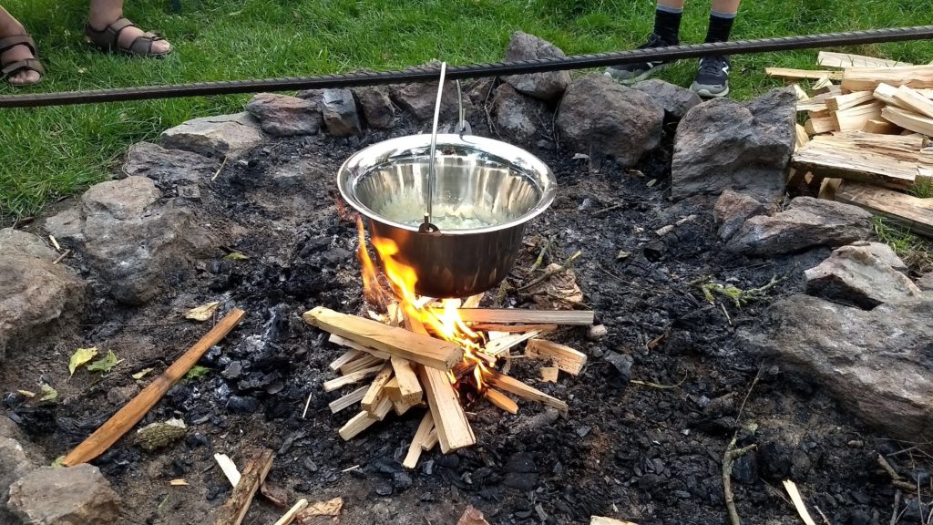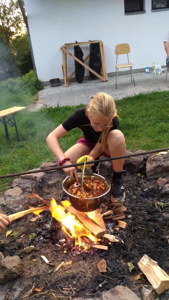 Na večer pak probíhalo klasické opekání buřtů a sezení u ohýnku. Hlavním kuchařem na místě byl jako vždy náš šéfkuchař Lojza Bartoš! Ten i pak dětem radil při přípravě buřt guláše na otevřeném ohni, který děti vlastními silami připravily.