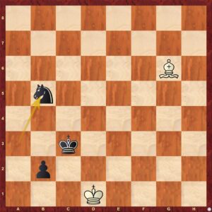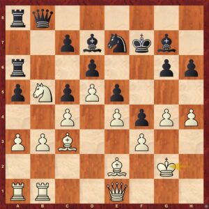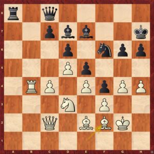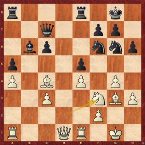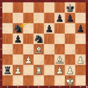 Tuto pozici jsem vybral čistě ze "strategického úhlu pohledu". Matyáš má dvojici střelců, černá jízda však zaujala velmi pevné popstavení, černá věž je aktivní, na slabinku b5 se bílý zdánlivě nemůže dostat. Dá se s tím vůbec nějak pohnout? Matyáš se zde rozhodl výtečně a evidentně použil známé pravidlo, že ... "výhoda dvojice střelců spočívá mimo jiné i v tom, že se jí můžeme ve vhodný (a hlavně výhodný) moment zbavit"! Ten moment nastal právě teď!