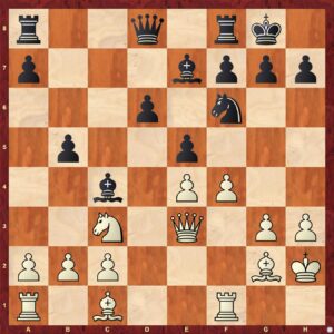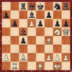 Kritická pozice této partie. Nešlo nic namítat proti prostému vývinu 14. ... Dc7=. Černý se však rozohnil a naplnil tak beze zbytku rčení ... "vrátilo se mu to, jako bumerang".
