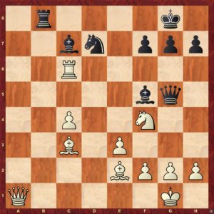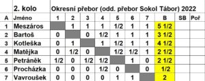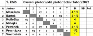 Turnaj čtyř bude předmětem samostatného článku, zde se soustředíme na okresní a oddílový přebor. Ve čvrtek se definitivně rozhodlo o přebornických titulech. V přímém souboji se „poprali“ o oba tituly dva borci … Luděk Meszáros a Roman Kotleška (oba Sokol Tábor). Před tímto duelem měl Luděk na svém kontě 9 bodů, Roman 8,5 bodu. Luděk tedy byl ve výhodě, nejenže mu stačila k titulu remíza, ještě měl ve vzájemné partii bílé figury. Pojďme se podívat na rozhodnutí …