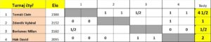 Najdorfova varianta sicilské hry. David mi připravil drsnou odvetu za nedělní prohru (zápas Šachklub Tábor – Spartak SÚ). Připravil si speciální variantu v najdorfovi a když se bílý správně nezorientoval, získal iniciativu a výhodu. Nadále hrál praklticky bezchybně a zaslouženě zvítězil. 0 – 1