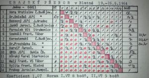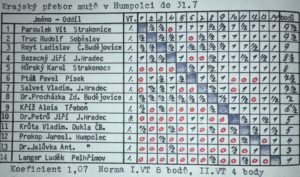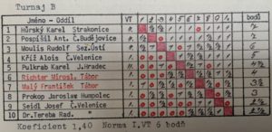 Zároveň oba dorostenci debutovali mezi muži. Krajský přebor mužů se v tomto roce konal v Blatné a mezi Jihočeskou elitou se mladíci neztratili. František obsadil 7.místo ziskem 7/13 a Karel 11.místo ziskem 5/13. Pro zajímavost, titul získal Vratislav Hora, pozdější známý trenér a velký propagátor šachu.