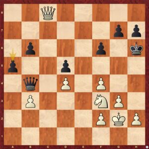 Duel žák vs trenér bývá vždy zajímavý a pikantní. V tomto kole svedl dohromady Davida a Zdeňka. Partie to byla na ostří nože, ostatně grunfeldova indická není pro poziční "šoupaly". Zahájení nejsano, poté iniciativa přešla do rukou Davida, získal vyhranou pozici, v časové tísni však nepokračoval přesně, Zdeněk získal mohutne protišance ... cca 20-25 tahů pak oba borci hráli na půlminutě, přičemž balancovali na kluzké rovině. Balancovali však výtečně až do situace na diagramu ...