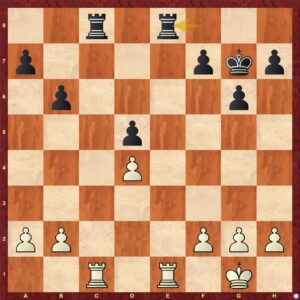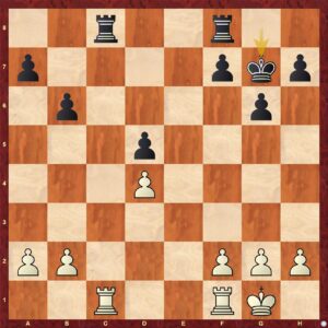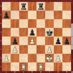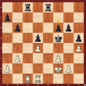 Základní, čili nultá pozice. Není to sice ještě čtyřvěžovka, ale začínáme z této pozice. Mohou z ní totiž vzniknout dva typy koncovky … Když jsem při partii zvažoval vznik této koncovky a následných čtyřvěžovek, hodnotil jsem pozice jakožto cca rovné s tím, že černý bude mít aktivnějšího krále. Z pohledu Hausnerova pravidla by tato jediná výhoda neměla být pro výsledek partie zásadní. Stockfishovo hodnocení … – 0.01 🙂