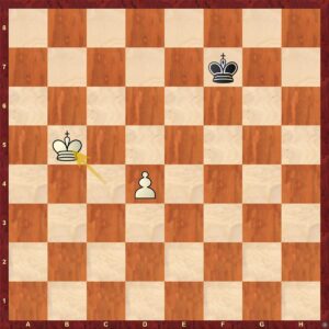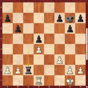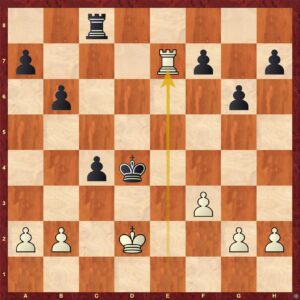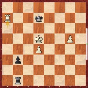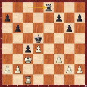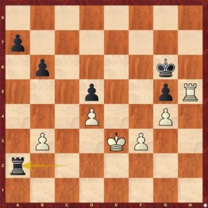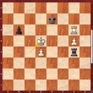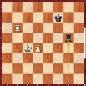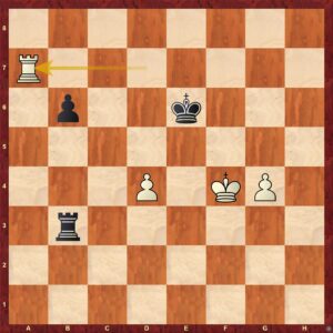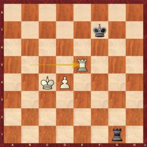 Vypadá to na první pohled, že bílý nemůže postoupit dále. Může ... po 63. Vf2+Ke6 a teď zmíněná malá taktika 64. Ke8! černý pěšce musí vzít 64. ... Vxd7 jenže po 65. Ve2+ Kd6 66. Vd2+ ztratí celou věž.