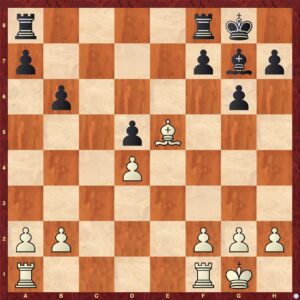 Pozice z partie. Je vidět, že pěšci jsou prakticky symetričtí, figurky jsou cca nastejno (důležité je, že černý nemá ŽÁDNÉ vstupní pole na e sloupci), jedině černý král je lepší. Dle Hausnerova pravdila to k výhře černého nestačí ...