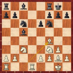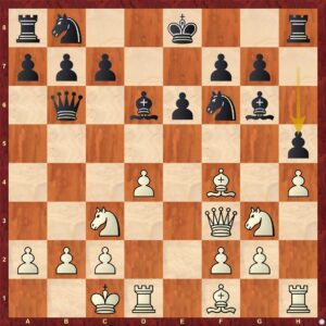 Ze zahájení vznikla vcelku vyrovnaná pozice. Jak už jsem psal, Eliška není trpělivý tvor 🙂 a tak se ihned pustila do akce tahem 11. ...e5?! Rozhodně bezpečnější bylo 11. ... Jg4!=