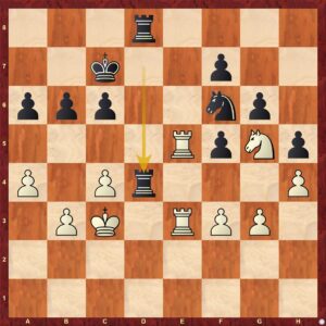 Blíží se kritický moment partie. Černá zahrála toršku neopatrně 33. ... a7-a6?! Pokud by Eliška chtěla černou "dusit", mohla zahrát poziční 34.a5! a po 34. ... b5 by mohla eventuálně v budoucnu využít oslabená černá pole b4, c5 atd. Eliška však nikdy neoplývala trpělivostí (:-) ) a tak přišlo 34. Vde3!?