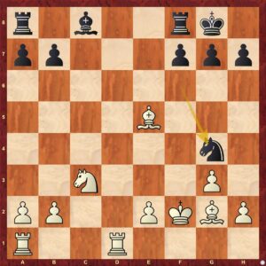 Jen uvedu tento diagram. tato pozice mohla vzniknout po správném 15. Ke1! Jxe5 16. Jd5 Se6 17. Vac1 +/_. Bílá má harmonicky krásně postavené figurky, centralizované, kdežto černá ne. Důležitá je i maličkost, černá nemůže oponovat po c sloupci pro prosté Je7+. A v případě výměny na d5 získá bílá do koncovky převahu dalekonosného střelce proti "krátkému" jezdci. Suma sumárum by černá musela řešit nemalé problémy.