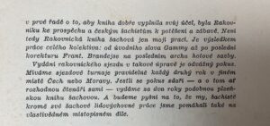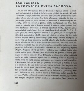 Inu, vytáhl jsem ji na denní světlo, oprášil a začal listovat. Okamžitě mě zaujaly dvě věci. První … kniha není čistě šachová, je rozdělena na dvě části. V první je řada kapitol věnovaná různým oblastem života v Rakovníku a na Rakovnicku, druhá část je věnována čistě hře šachové. Druhá věc … autor knihy, mistr „Opo“, neboli mezinárodní mistr Karel Opočenský. Četl jsem od něj už řadu knih a musím jednoznačně říci, že píše o šachu nádherně. Bylo rozhodnuto, knihu už jsem držel pevně v rukou a odnášel si jí po vyřízení ligové přihlášky domů.