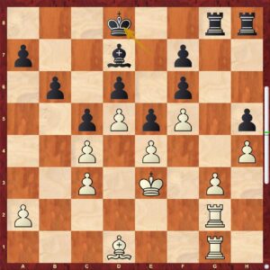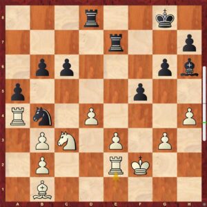 Mezitím „někde“ přichází o kvalitu Honza Žilavý. Na stole stál dámský gambit, typická tzv. karlovarská struktura. Bílý stál ze zahájení lépe, Honza se držel a snažil se vykouzlit nějakou protihru. Záhy po 20.tahu nezahrál Martin Tupý nejpřesněji a hra se na chvíli vyrovnala. Bílý pak okamžitě hru přiostřil a vznikl kritický okamžik partie …