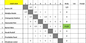 Ve vedení je zatím Lojza Bartoš s půlbodovým náskokem před Radkem Matějkou. Ovšem pečlivý čtenář jistě zaregistroval, že Radek má o partii méně a navíc, že ve vzájemném souboji Lojzu porazil! Čili hlavním adeptem na celkové vítězství je Radek Matějka.