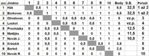 Jak vidno, turnaj skončil „mrtvým během“ dvou hráčů a to FM Davida Háka a Milana Borkovce. Oba nasbírali osm a půl bodu a o vítězství se rozdělili. Nakonec jsem vyhlásil jako vítěze Davida Háka, jeho remíza je cennější černými, než moje bílými :-). Mě postačil titul oddílového přeborníka pro rok 2025 🙂