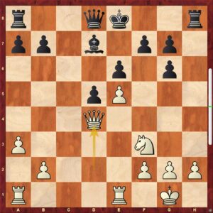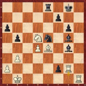 V této pozici totiž zahrál pan Juřek zvláštní 17. ... Vc8?! a po 18. Dxa7 stál hůře. Michal však nepokračoval úplně přesně a tak se hra za chvíli srovnala a skončila remízou věčným šachem. Je otázkou, proč černý vlastně pěšce na a7 odevzdal, mohl zahrát třeba 17. ... Db6 či dokonce 17. ... 0-0 s cca rovnou hrou. Rošáda sice může vypadat nebezpečně, ale bílý mat prostě nedá, např. 18. Dg4 (s ideou Jg5 a Dh4) Vc8 19. Jg5 Vc4 20. Dg4 f6 s dostatečnou protihrou ...